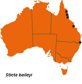 | An endemic species in eastern Qld and north-eastern N.S.W.; epiphytic on tree trunks, tree roots and vines in humid rainforest at altitudes of 100–1080 m. | ||