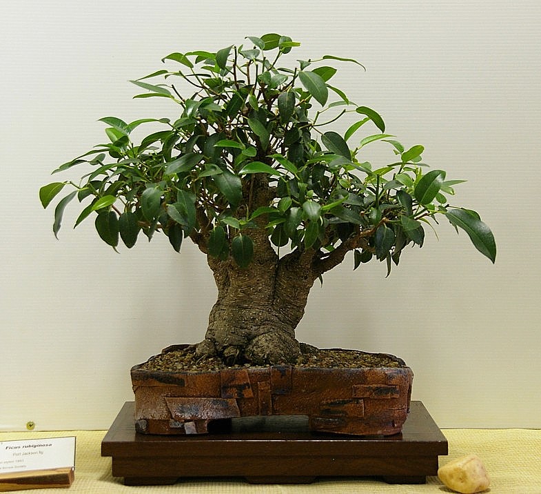 Ficus rubiginosa The tree was bought as tube stock and has always been grown as a bonsai and always in a bonsai pot. Port Jackson figs develop a thick base if grown in a bonsai pot and the rest of the tree is a result of judicious trimming, wiring and shaping over the life of the bonsai. If the figs are well fertilized and healthy they can be defoliated at least once a year and this gives good ramification to the branches and also gives us small leaves. |