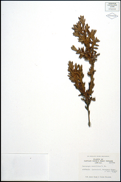 Leucopogon ruscifolius Collected by Banks and Solander at Endeavour River, Queensland July 1770. This specimen would probably have been collected from the northern bank of the Endeavour River, as its preferred habitat is among the windswept heath vegetation between sand dunes. This species can grow into a small tree but is usually a shrub. The flowers are white and the fruits small and green. |
