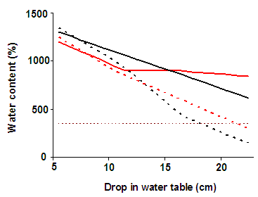 The species of Sphagnum vary in their ability to convey water by capillary action. The vertical axis in the following graph shows the water content in the capitula of four Northern Hemisphere Sphagnum species as the water table is experimentally lowered from 5 to 22 centimetres below the Sphagnum surface. The four species are Sphagnum fuscum (solid red line), Sphagnum rubellum (solid black line), Sphagnum balticum (broken red line) and Sphagnum tenellum (broken black line). The horizontal, dotted line shows the approximate water content needed for Sphagnum to maintain 50% of the maximum photosynthetic rate.