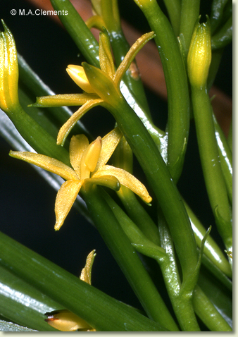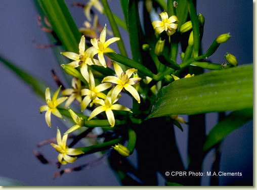 Terrestrial evergreen herb forming grass-like clumps. Roots wiry, much branched, with variously sized fleshy tubercules. Stems single or multiple, erect, 10-25 cm long, tough, fibrous, wiry. Leaves scattered along stem, erect to pendulous, whorled, sessile, bases sheathing stem, lamina subulate, 10-20 cm x 0.7-1 cm wide, dark green, thin-textured, leathery, apex filiform. Inflorescence axillary, racemose or sparsely paniculate, arching to pendulous, 50-100 mm long, wiry; ovaries erect, slender. Flowers 5-40, non-resupinate, erect, star-shaped, 8-10 mm wide, yellow. Perianth segments and labellum similar in size and form; narrowly triangular, 4-6 mm long, 1-1.5 mm wide, distal margins involute, apex cymbiform; sepals and petals with exterior keeled midrib. Callus absent. Column porrect, 3 mm long, not fused for entire length; filaments and stigma free at distal end. Column foot absent. Pollinia absent. Capsules erect, indehisent, disintegrating when ripe.