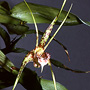 Epiphytic or lithophytic herb forming pendulous clumps. Pseudobulbs pendulous, 30-60 cm x 0.6-0.9 cm wide, narrow and wiry in basal half, becoming broader and quadrangled along length, narrowing at apex, greenish brown. Leaves 2-5, prostrate, apical, ovate, 5-9 cm x 2-4 cm, dark green, thin, leathery, apex acute. Inflorescence an axillary raceme, 10-35 mm long, from upper nodes of pseudobulb, filiform. Flowers 1-4, resupinate, porrect, 70-120 mm x 60-80 mm, greenish yellow with prominent red blotches, labellum white with red or purplish lines. Sepals narrowly triangular, tapered, apices filiform. Dorsal sepal erect, 40-70 mm x 3-5 mm. Lateral sepals divergent or sometimes crossed, falcate near base, 30-70 mm x 7-10 mm, occasionally twisted, bases fused to column foot. Petals divergent, erect, linear, 25-40 mm x 1.5-2 mm. Labellum projected forward, recurved, 11-15 mm x 17-20 mm, 3-lobed; lateral lobes erect; midlobe narrow, shortly hairy, sharply pointed, with 3 prominent parallel ridges. Column 4-5 mm long. Column foot slightly curved, 8-10 mm long, at right-angles to column. Capsules pendulous, dehiscent.