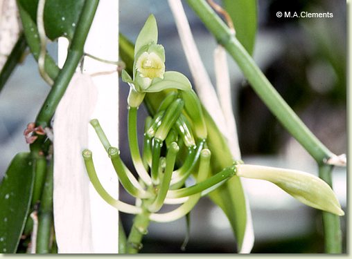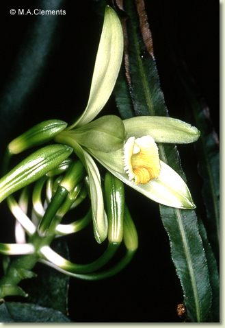 Terrestrial herb forming large climbing clumps. Stems climbing, long and vine-like, green, anchored by roots from the nodes. Leaves scattered along stem, alternate, elliptic to lanceolate, 10-22 cm x, 5-7.5 cm, bright green, shiny, thick, leathery. Inflorescence an axillary raceme, condensed, 20-75 mm long. Flowers 5-20, crowded, opening singly, resupinate, porrect, 60-75 mm x 40-60 mm, greenish yellow, strongly fragrant, short-lived. Petals and sepals narrowly ovate, not opening widely. Labellum tubular, margins fused to column, 50-70 mm x 25 mm, broadly flared at apex, with long narrow basal stalk and central cluster of hair-like lobes, margins crinkled. Capsules pendulous, cylindrical, often curved, 10-20 cm long.