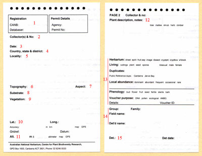 It is standard practice in Australia herbaria for the collector to write up their own field note book labels and to then pass the data on to a databaser. Once the draft labels have been produced from the database, it is the responsibility of the collector to thoroughly check them for accuracy. This is because only they can satisfactorily interpret their own field note book data, tidy it up, and correct any errors. Having made any neccessary corrections to the draft labels, these are then passed to the databaser once again for the production of final labels. If you do not feel inclined to follow your collecting through to this extent, you should not collect. See a botanist if you are unsure about any aspect of producing labels.