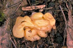 In the case of the ascomycetes, at one stage the bulk of the ascomycete truffle-like fungi were classed by themselves and thought to be quite separate from the ascomycetes which released their spores forcibly. However, here also, more detailed research has shown close connections between the truffle-like species and the "ordinary" cup-like ascomycetes. For example, an ascomycete genus with some variety in fruiting body form is Peziza. The bulk of Peziza species are disk-like or shallow cups, such as Peziza retispora click to enlarge shown here. However, here again is Peziza whitei, shown here, a very convoluted truffle-like fungus in the same genus.