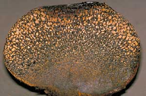 A vertical cross-section of such a fruiting body shows a powdery region at the top, but with the lower part looking as though it consisted of a multitude of densely packed rice grains (called peridioles), comprising packets of spores. The peridioles are relatively thin skinned and the whole mass is contained in a brittle outer skin. This highly stylized diagram shows a vertical cross-section through a very immature Pisolithus fruiting body. The black circle represents the outer skin, the internal tissue is in brown and there are numerous chambers (shown in white). Each of these chambers eventually becomes the interior of a peridiole. These chambers are isolated from each other and contain the basidia. The chambers fill quickly with a gelatinous matrix, the spores become detached from their basidia and complete their development (after detachment) within the gelatinous interior. Of course, in most cases people only see the Pisolithus fruiting bodies in the advanced, powdery stage as shown in the photograph.
