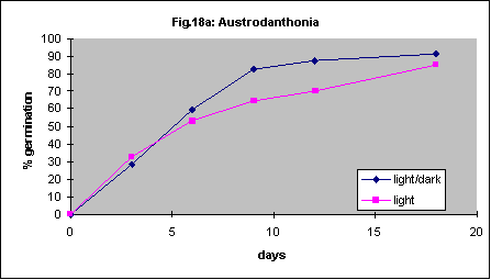 Vernalisation (low temperature and moist conditions) is well known as a promoter of germination in cereal grasses but keeping imbibed Themeda triandra seed for 7 days at 4° C before incubation at 20° C reduced germination (Fig.20).