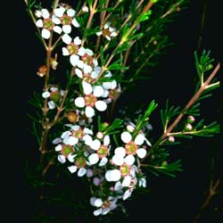 Each lateral produces up to eight buds which open to small, flat flowers like those of any tea tree. The flowers are 1 cm across with five rounded white or pale pink petals, often tinged with a deeper pink at the base, and a green eye.All are arranged facing upwards along the stems in dainty sprays. Flowering is profuse in spring and autumn. At other times in response to rain or watering, flowers are usually dotted about the shrub.
