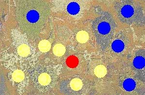 The following image helps explain what is shown in the previous two photos. The yellow dots indicate lichens, the blue dots show mosses and the one liverwort is marked by a red dot.