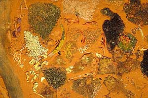 The following pair of photographs (which can be enlarged) show how dramatically some of the biological soil crust organisms react to water. The photographs depict an artificial set-up, in that these specimens were not all growing in the one, small area. However, they were all collected from the dry western half of New South Wales. The photo on the left shows the scene when dry and the photo on the right shows the same scene wet. The response to water was quite rapid. It took only a minute or two for the transformation.