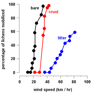 Over the flat surface small lichens could be mobilized by winds of about 2.5 kilometres per hour while the largest specimens needed wind speeds of over 17 kilometres per hour. Generally, once moving, the specimens would continue to do so. On the styrofoam with the shallower relief the threshold speeds were about 40% higher. Moreover, in the experiment some of the larger specimens either were not moved or were easily stopped by the roughness. However, the equipment available could not generate wind speeds greater than about 18 kilometres per hour and it is likely that higher wind speeds would have moved the larger specimens. On the rougher styrofoam several specimens were moved but all were quickly caught by the surface depressions so no effective wind transport took place. Wind speeds of 30 to over 40 kilometres per hour had been recorded at the collection site, but the higher speeds were more common during the rainy season. At that time the lichens would be saturated and considerably heavier so there would be no guarantee that effective wind transport could take place at that time. The author of the study suggested that effective wind transport took place during occasional episodes of strong winds during the dry season.