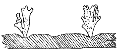For her doctoral thesis of 1922 Ethel Mellor undertook a detailed examination of 77 pieces of old stained glass, focussing on corrosion and lichens. The glass had been collected for her from churches in several areas of France, presumably during restoration work on church windows. All the pieces showed signs of deterioration and the majority bore lichens. Mellor recorded a total of 16 vitricolous species, though she noted a number of sub-specific variants within three of those species so bringing the total number of taxa to 22. Diploicia canescens was the most common taxon, being found on 32 pieces and the other two in the top three were Pertusaria leucosora (25) and Lepraria flava (17). The current name for the third species is Chrysothrix candelaris. The species reported from glass are not confined to that substrate. For example, Diploicia canescens is also found growing on rock or bark and Chrysothrix candelaris is most often found on wood. Mellor found Ramalina polymorpha var. ligulata on just one piece of glass and eight other taxa were also found on just one glass sample each. However, though a taxon may have been found on just one piece of glass it could be abundant when found. Thus on the glass sample with the Ramalina there were about 20 of the Ramalina thalli. The following diagram (figure 2 in Mellor's thesis) shows two upright Ramalina thalli (each about 7 millimetres tall) growing from slight pits in the glass surface and most of the Ramalina thalli were anchored in such pits. This piece of glass (with an area of 82.5 square centimetres) also supported a single 7 millimetre diameter thallus of Diploicia canescens, several thalli of Pertusaria leucosora (from 4 to 22 millimetres in diameter) and remnants of what might have been Lecania erysibe.