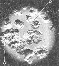 The idea of MICROHABITATS is important in lichen ecology. Sometimes a shift of just a few centimetres means a significant change in conditions and hence a change in ability of certain lichens to establish or grow. Some of the observations made on this page highlight microhabitats. For example, it's been noted that, generally, it is difficult for lichens to establish on smooth glass but that corroded glass provides easy points of establishment. It may be that tiny pits or furrows make it easier for propagules to lodge but it is also likely that moisture will be held at least a little longer in such pits or furrows than on the smooth surface, so providing more moisture for a developing thallus. The accompanying photo (again from Mellor's thesis) shows a number of pits with small lichen thalli in them. Contrariwise you've seen that, at least in Mellor's samples, Diploicia canescens seemed to grow more readily on smooth surfaces. So, in pitted glass you have distinct smooth and pit microhabitats side by side. Mellor wrote that she found Biatorina erysiboides only on what had been the inner surfaces of church windows. Certainly the levels of light and humidity would be different on the inner and outer surfaces so that the two sides of a glass window provide different microhabitats.