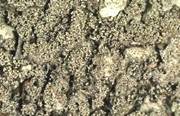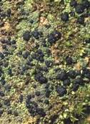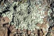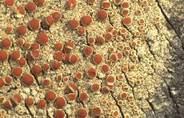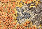 Mixed lichens on concrete showing an inhibition zone in the drip-line below a handrail |