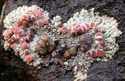 Placopsis - two thalli, with pink apothecia and brown to blackish-brown cephalodia