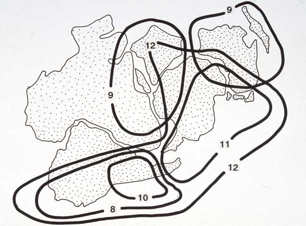 The number x = 9 is characteristic of all the remaining, derived and advanced genera of the Old World, from Australia to Asia and Africa (tribe Lorantheae). Similarly, all of the remaining genera of the New World characteristically have x = 8, including the large, advanced tropical genera of tribe Struthantheae. The pattern which emerges is therefore one in which an ancestral stock with x = 12 was widespread in the southern lands, and in which stepwise reduction to x = 9 and 8 has preceded massive evolutionary radiation of the family in the tropics. That this radiation has been independent in the Old and New Worlds is indicated by the fact that the derived stocks, with x = 9 and 8 respectively, have closer affinities with the old southern groups than with each other. A limited independent radiation in the Indomalayan region of the Old World has apparently occurred in a stock which has retained the number x = 12.