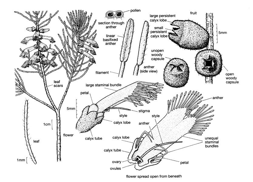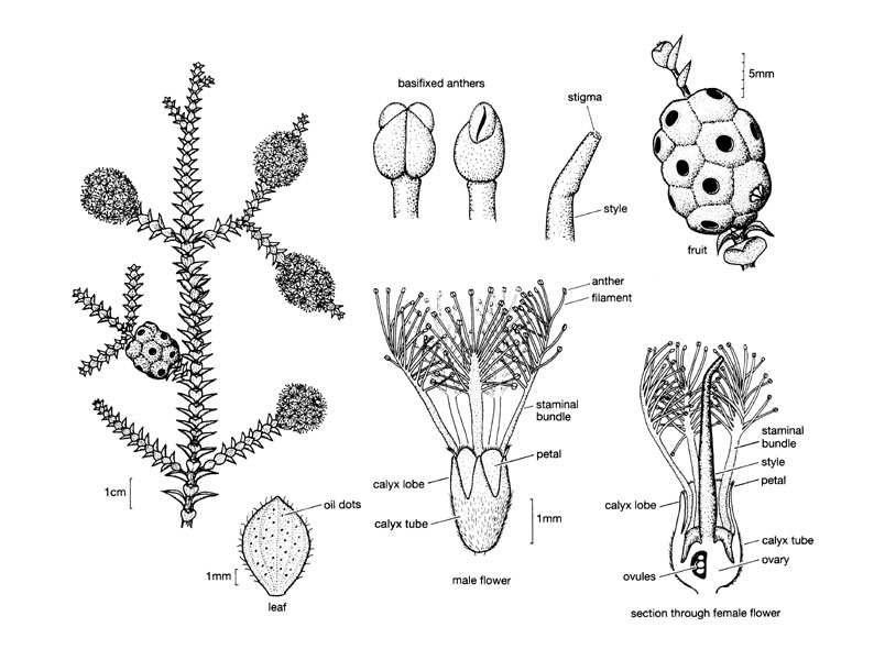 A series of illustrations for the type species of each genus in the Leptospermum alliance of the family Myrtaceae. The illustrations were prepared by Murray Fagg for the book Bottlebrushes, Paperbarks & Tea Trees and all other plants in the Leptospermum alliance, written by John W. Wrigley and Murray Fagg, and published by Angus & Robertson (1993). Illustrations Copyright © Murray Fagg 1993 |
