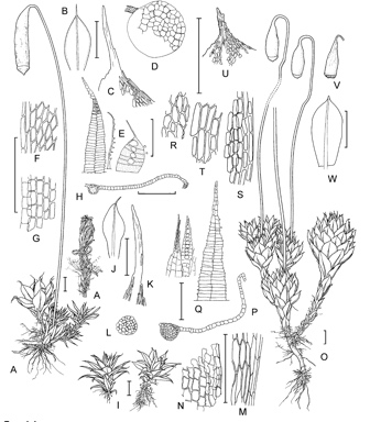 Caption: A-H, Rosulabryum capillare. A, Left: habit with sporophyte; right: leaves spirally arranged (dry specimen). B, Leaf. C, Cells at leaf apex. D, Rhizoidal tuber. E, Peristome: exostome tooth (left); endostome cilium (centre) and segment (right). F, Mid-leaf cells. G, Basal laminal cells. H, T.S. of leaf (J.R.Spence 4364, NSW). I-N, R. leptothrix. I, Habit (dry specimen). J, Leaf. K, Cells of leaf apex. L, Rhizoidal tuber. M, Mid-leaf cells. N, Basal laminal cells (I.G.Stone 22764, MEL). O-W, R. microrhodon. O, Habit with sporophyte (dry specimen). P, T.S. of leaf. Q, Peristome: endostome (left); exostome (right). R, Upper laminal cells. S, Mid-leaf cells and margin. T, Basal laminal cells. U, Leaf apex. V, Capsule with peristome. W, Leaf (J.R.Spence 4585, NSW). Scale bars: 1 mm for habit; 0.5 mm for leaves; 100 ?m for cellular drawings.Illustrators: L. Eklan
