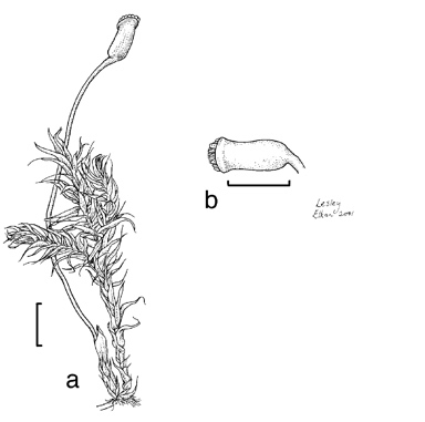 Caption: A, habit of gametophyte and sporophyte; note the non-acuminate perichaetial leaves. B, capsule (W.A.Weymouth 2900 HO). Scale bars: 1 mm. Reproduced from H.P.Ramsay, W.B.Schofield & B.C.Tan, The Journal of the Hattori Botanical Laboratory 95: 39, fig. 17e?f (2004).Illustrators: L. Eklan & H.P. Ramsay