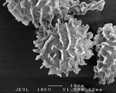 SEM image of distal view of spore + partial views of 3 other spores.