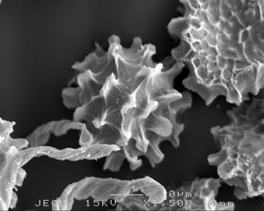 SEM image of distal view of spore + elaters and proximal views of 3 more spores.